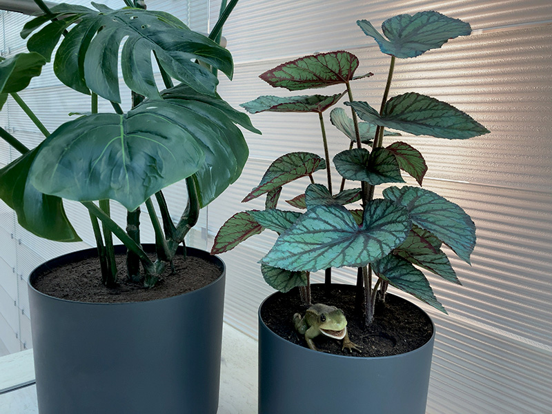 通路に置かれた植木鉢の中にいるのは小さなカエル!
